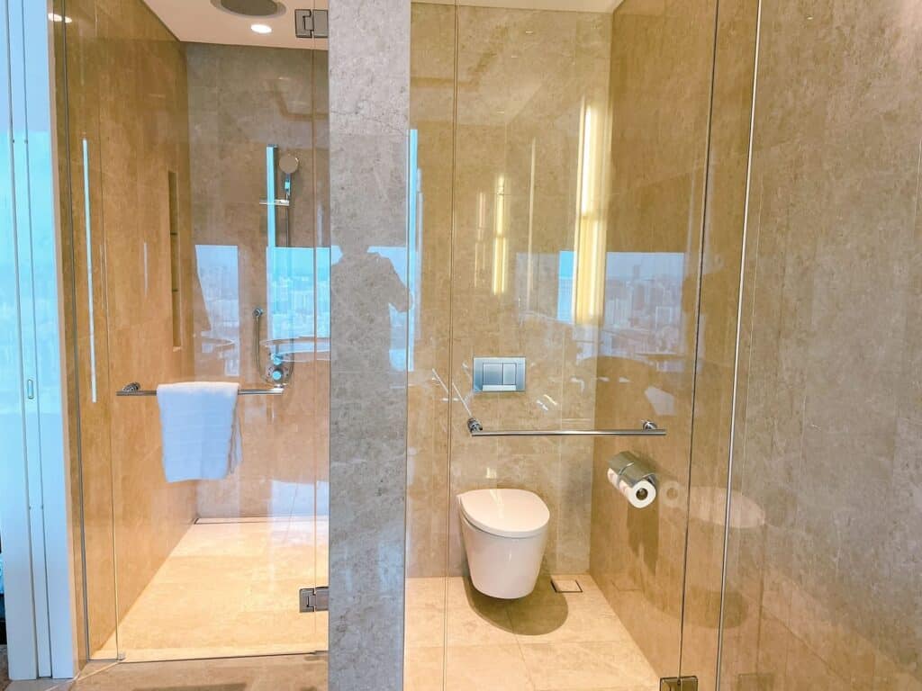 また、細かいポイントですが、シャワーのノズルが硬めの作りなので、シャンプーをしている最中や体をシャワージェルで洗う際にシャワーを止めてしまうと、ジェルのぬめりでノズルを回すことに苦戦するので、シャワーは付けっぱなしで利用されることをおすすめします。