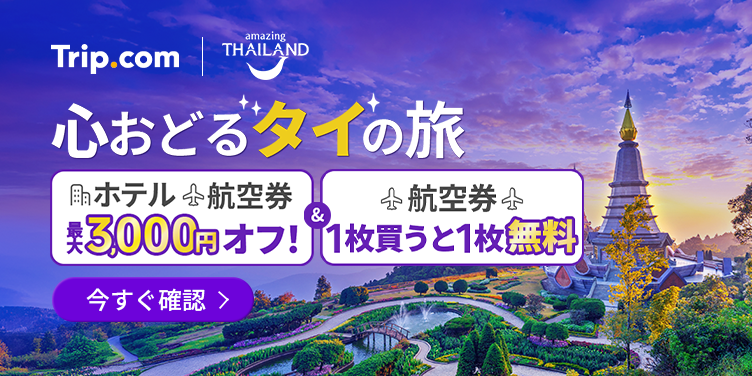 | 【終了】心踊るタイの旅へ | 2025年10月31日まで | ・タイ行き航空券50%OFF(最大25,000円オフ) ・ホテル、航空券が最大3,000円オフになるクーポン配布 ・3連泊以上で最大60%割引 ・空港送迎12%OFFクーポン配布 |
