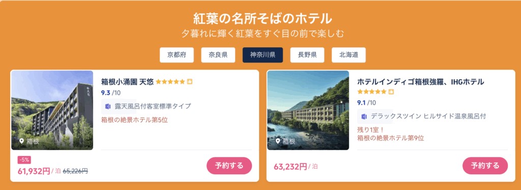 特に紅葉シーズンに人気の高い、神奈川県や京都・奈良などの高級温泉旅館や高級ホテルを中心に割引率が高い傾向です。