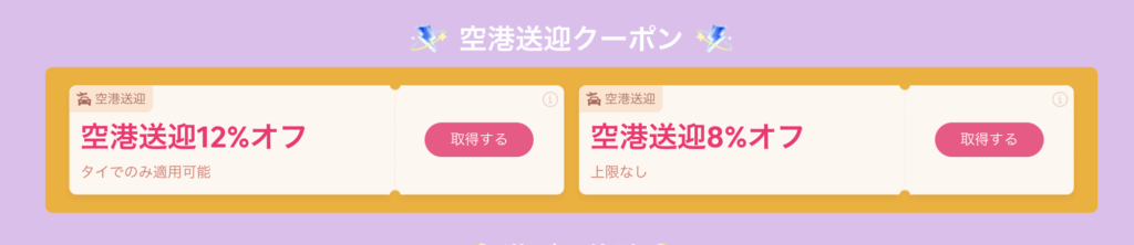 スワンナプーム国際空港やドンムアン国際空港から市内の目的地に向かう際に利用できる空港送迎が12%OFFになるクーポンも配布しており、タイ旅行をお得に楽しむなら今しかありません!
