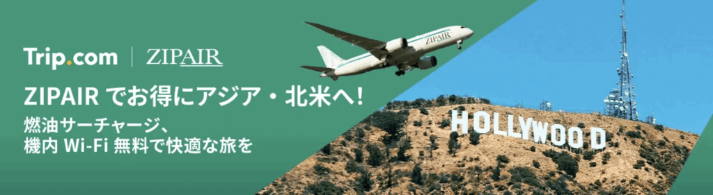 | ZIP AIR キャンペーン | 終了日未定 | ・日本からホノルルまでの往復航空券が5万円台から販売 ・日本↔韓国路線 往復が18,750円から販売中 |
