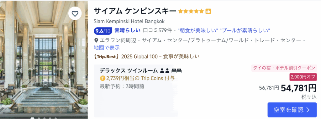 「心踊るタイの旅へ」のキャンペーンページへ行き、クーポンの「取得ボタン」をクリック後、実際にバンコク市内のホテルを検索すると、「タイの宿・ホテル割引クーポン」という2,000円のクーポンが適用され、通常56,781円(税込)の高級ホテルが54,781円で予約できました。