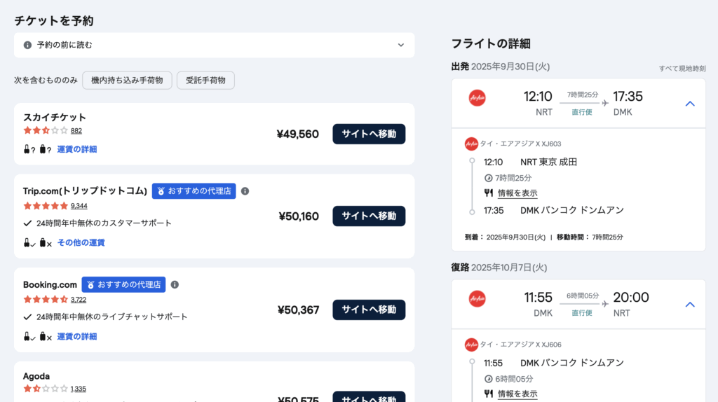 私は実際に秋にバンコクへ行く予定があったため、航空券の予約をしてみました。