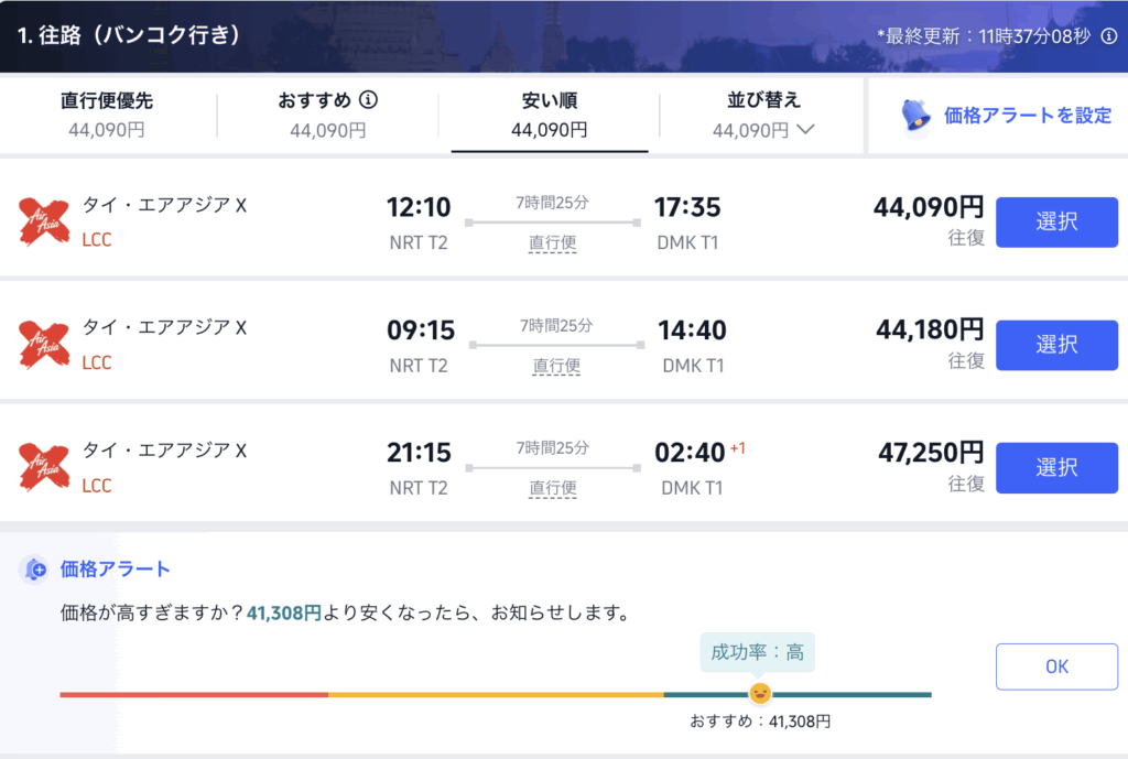 「心踊るタイの旅へ」のキャンペーンページ経由でエアアジアの往復航空券を検索すると、最安値のプランが44,090円(税込)で出現しました。