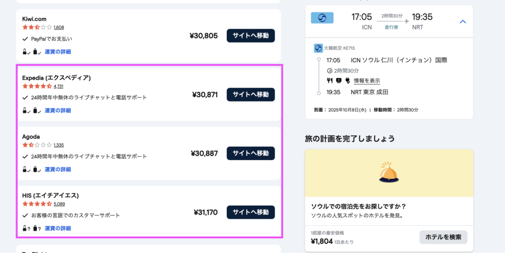 一方でスカイスキャナーで同じ日程・同便で検索すると、アゴダ・エクスペディアでは30800円(税込)程度、エイチアイエスの場合は31,170円(税込)で販売されており、トリップドットコムで予約した方が600円から1,000円程度安く予約できることが分かりました。