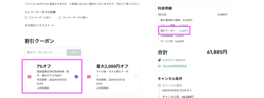 申し込みが確定する前に、Trip.comの割引クーポンコードが適用されているか確認しましょう。
