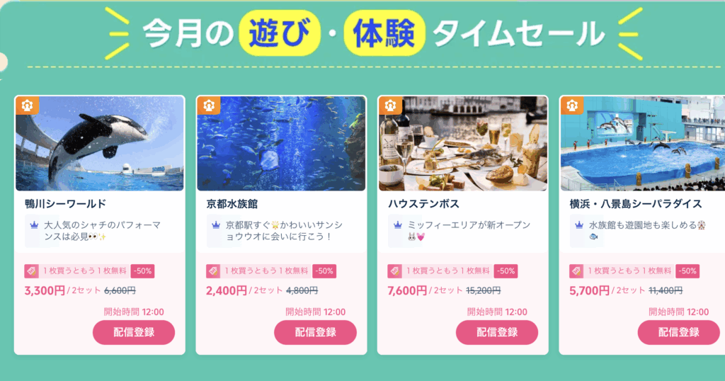 例えば、鴨川シーワールドの入場チケット2枚セットは通常6,600円のところ、なんと50%引きの3,300円で購入可能です。