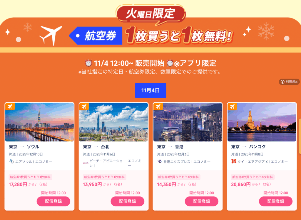 | 【終了】お得に冬旅 | 2025年12月14日まで毎週火曜日配布 | ・航空券最大2,500円分クーポン配布 ・ホテル宿泊最大3,000円分クーポン配布 ・1泊2万円以上のホテルが5,900円定額料金で宿泊可能 ・ソウル・台北・バンコクなど、人気観光都市行きの航空券を1枚買うともう1枚無料 |