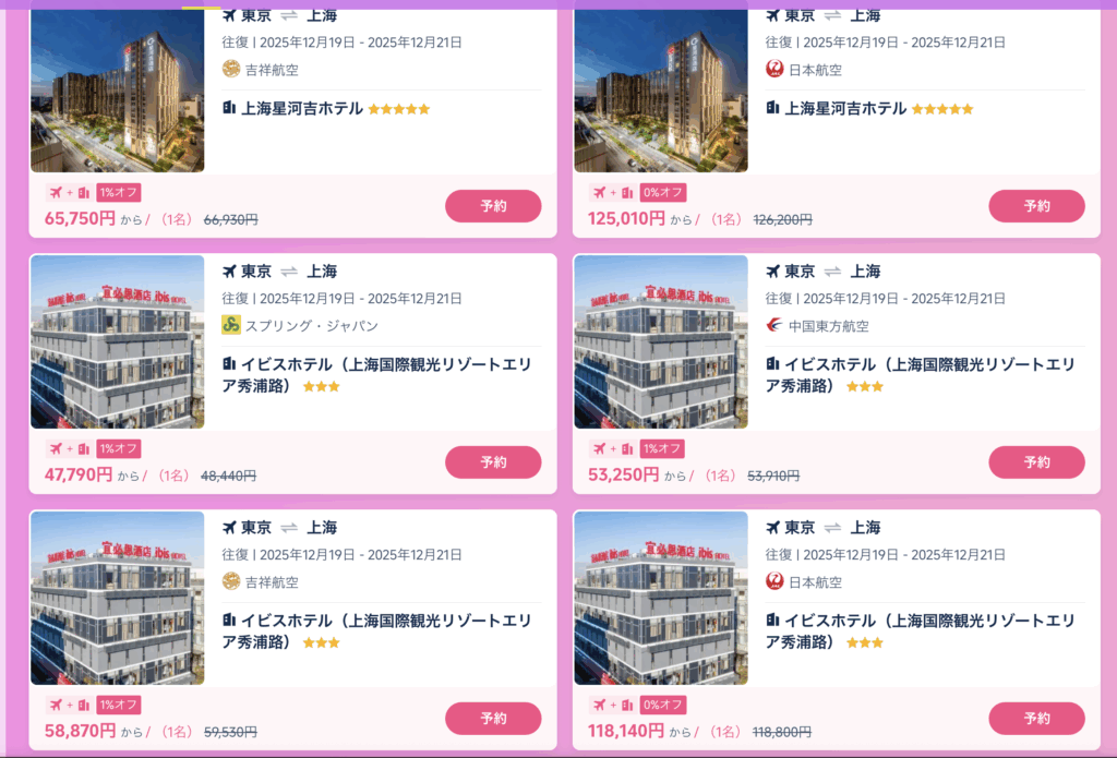 | 【終了】今すぐ上海旅 | 2025年11月17日〜11月23日まで | ・上海の人気ホテルが最大60%引き ・上海旅行プランが2泊3日48,000円〜 |