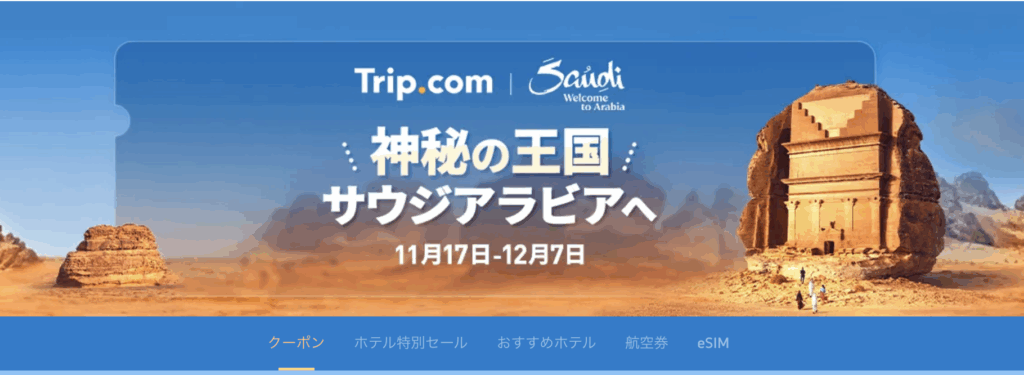 | 【終了】神秘の王国サウジアラビアへ | 2025年11月17日〜12月7日まで | ・200,000円以上のサウジアラビア行き航空券で利用できる10,000円オフクーポン
