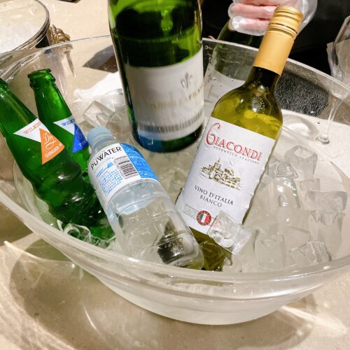 スパークリングワインや白ワインはシャンパンクーラーで冷やされています。