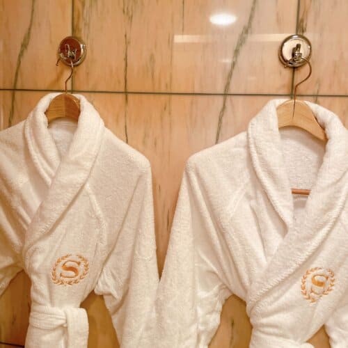 バスルームの壁にはシェラトンロゴ入りのバスローブも用意されていました。