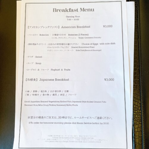 ただ、今回はスイートルームに宿泊していることもあり、インルームダイニングで朝食をいただけないかフロントにリクエストしたところ可能とお返事をいただきインルーム朝食に変更。