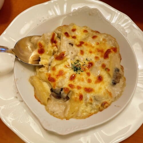 マカロニグラタンは熱々!マカロニと濃厚なチーズが組み合わさりとっても美味しい!持参したスパークリングワインと良く合います。量は少し少なめでした。